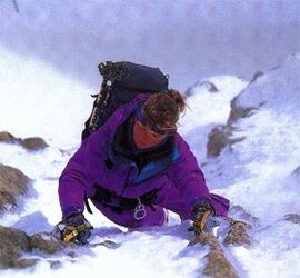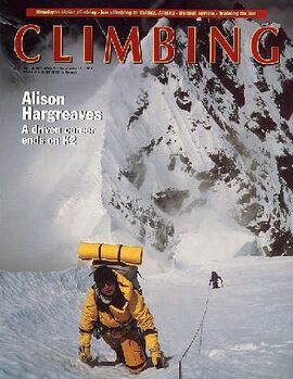 [[תמונה: alisonhargreaves2.jpg|שמאל|ממוזער|270px|אליסון הרגריבס בהימלאיה, על העטיפה של Climbing Magazine מס' 156 (צילום של [[מארק טווייט]])]] | |||