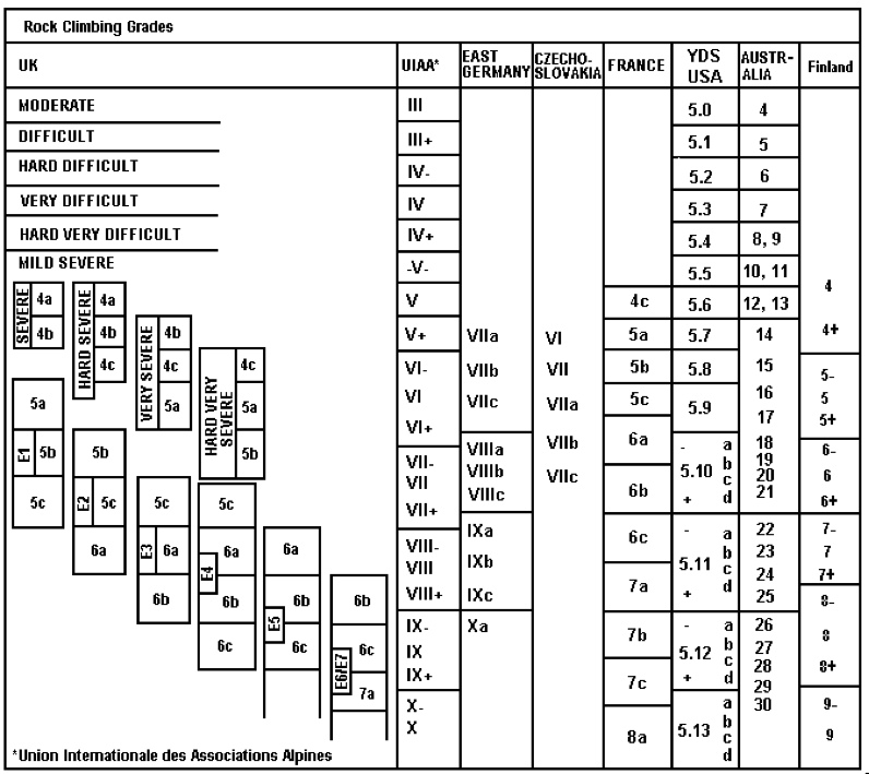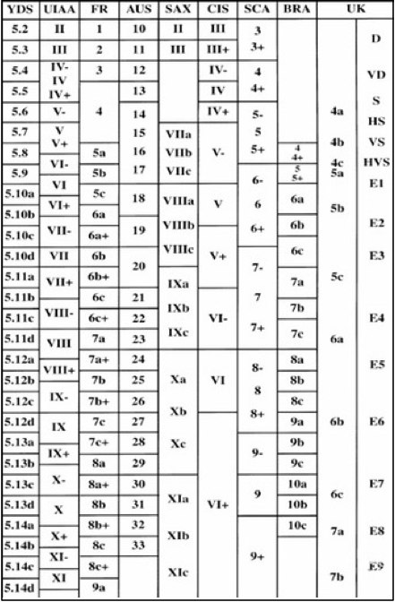 בטבלה הבאה מרוכזים הדירוגים הנפוצים: צרפתי, בריטי, אוסטרלי, אמריקאי ו-UIAA (גרמני) וגם רוסי/פולני/צ'כי, מזרח גרמני, ופיני.