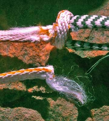 בקשר כזה, מקבלים את שתי התופעות שתוארו. קודם כל, השפה של הרצועה נשחקת תחת עומס ברצועה האחרת (או בחבל או בכבל). זה גורם להופעה של קרעים קטנים בשפת הרצועה. בהמשך, הקרעים הקטנים גדלים במהירות עד לכשל של הרצועה. בתמונה נראית רצועת דיינימה שנקרעה בקשר כזה תחת משקל גוף!
