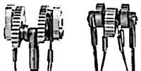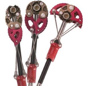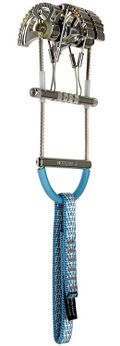 בקבוצת בעלי הכבל הכפול ניתן למצוא מכשירים דומים רבים. חברת HB מייצרת את HBQuadcam, בחברת Metolius מייצרים את 3Cam ו- 4Cam, ואצל WB מייצרים את TCU: Tri-Cam-Unit, ועוד רבים אחרים. אפילו שתי המידות הקטנות ביותר של הקמלוט (וכל המידות של קמלוט בעיצוב המקורי) המשיכו כמה שנים להיות מיוצרות עם כבל כפול. הכבל מתחבר בצורת U לשני צידי הציר של אבן העיגון (ציור 18.7). החיבור נעשה בהלחמה, שהיא שיטת חיבור חזקה מאד. המכשירים בעלי הכבל הכפול מאפשרים הפעלה באצבע אחת (מה שקרוי בפי המקצוענים one finger trigger). החסרון הבולט ביותר של הכבל הכפול הוא שהחיבור הכפול לציר עשוי, במקרים מסויימים לגרום לחלוקה לא סימטרית של הכח, ולסיבוב אבן העיגון בתוך החריץ. במקרים מסויימים סיבוב כזה עלול לגרום לשליפתה של האבן. בציור 18.8 ניתן להשוות בין הראשים של cam עם כבל אחד ועם שני כבלים.