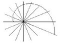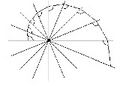 מספיק להבין כי הצורה הגיאומטרית של הכנפיים קובעת כי זווית המגע בין הפרנד לדפנות החריץ תהיה קבועה, בלי תלות ברוחב החריץ. על כל פנים, פרנדים בנויים כעקומה ספיראלית, כזו שתוך כדי הסיבוב שלה היא הולכת ומתרחקת מן המרכז. עקומה כזו ניתן לצייר בקלות. נקבע נקודה כלשהי כמרכז, נשרטט קרניים היוצאות ממנה במרווחי זווית קבועים, ונבחר על אחת מן הקרניים נקודת התחלה. נבחר זווית כלשהי ונתחיל לשרטט את העקומה עצמה (בציור 18.2 הזוית היא ˚97). מן הקרן שנבחרה כנקודת התחלה נשרטט קטע ישר כאשר הזווית בינו לבין הקרן היא הזווית שנקבעה. בנקודה בה הקו חותך את הקרן הבאה נתחיל קטע חדש באותה הזווית הקבועה. הקו שקיבלנו בנוי מקטעים ישרים כפי שנראה בציור 18.2. הזוויות המסומנות בציור כולן שוות והן ˚97. אם נקטין מאד את מרווחי הזווית בין הקרניים, ונגדיל מאד את מספר הקרניים, נקבל עקומה חלקה כפי שנראה בציור 18.3. בעקומה כזו הזוית בין העקומה למשיק, בכל נקודה, היא קבועה ומכאן שמה: עקומה שומרת זוית. אם הזווית בין הקרן לקו קטנה מתשעים מעלות, העקומה הולכת ומתקרבת אל המוקד. אם היא בדיוק תשעים מעלות, נקבל עיגול, כלומר המרחק אל המוקד נשאר קבוע, ואם הזווית גדולה מזווית ישרה, העקומה הולכת ומתרחקת מן המוקד.