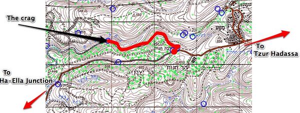 On rd 375, between Ha-ela Junction and Tzur Hadassa, northof the road there's a small parking. Turn there and follow a good dirt road marked green. The road veers to the left and the marks change to blue. Keep on that road for 2.4km. there is a wide path going diagonally upwards to the left. A few minutes walk will take you to the crag.