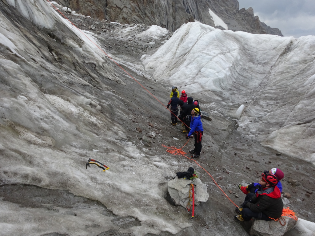 יום שני – שיעורי קרח: עלייה (של כ-400מ׳) לקרחון ותרגול עם קרמפונים וגרזנים על קרח שטוח, תלול ותלול מאד.