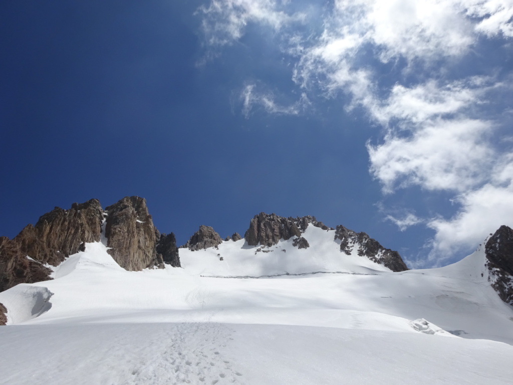 העלייה לכתף של צ'אפאייב היתה מפרכת. רוב הדרך היתה מורכבת מקטעי טיפוס מעורב (קרח/סלע) וביניהם קטעי שלג פחות תלולים. עדיין לא היינו מאוקלמים ולמרות שלא עלינו עם ציוד (אוהלים, גז וציוד שינה) זה לקח כשש שעות. סיימנו עם קטעי הסלע, ונותרו כ-200מ' של טרברסה ועלייה מתונה יותר בשלג כשמזג האוויר החליט להתהפך עלינו. הגענו לגובה 6000מ', לא רע בכלל, והחלטתי שמספיק ודי וירדנו לבלות לילה נוסף בקמפ 2.