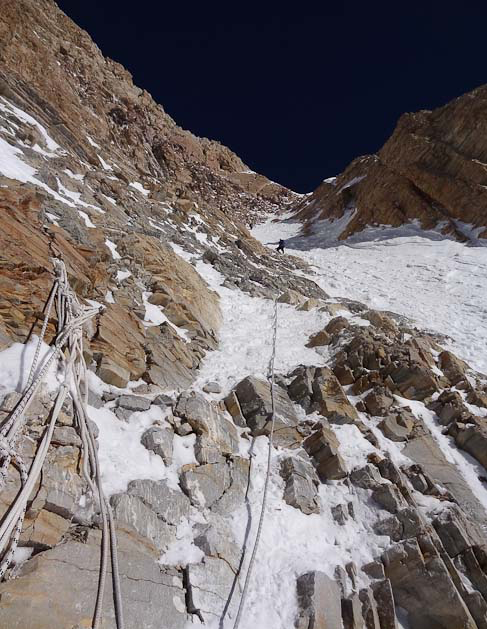 כאן המקום לציין שהמסלול כולו מסומן/מאובזר בחבלים קבועים. זה לכאורה טוב, אבל חלק מהחבלים האלו הם בני כמה שנים, רובם פסולים, חלקם לא מחוברים לעגינות בכלל, היו חבלים ללא מעטפת, חבלים כמעט ללא ליבה, חבלים קפואים, שקועים בקרח ועוד כל מיני הברקות. אחת המשימות של המוביל במשלחת כזו היא לטפס ראשון ללא שימוש בחבלים הקבועים (כלומר, אפשר להתאבטח עליהם, אבל ממש ממש לא כדאי למשוך עליהם), ולבדוק כל עגינה וחבל, ולהעביר את המידע למטפסים האחרים בקבוצה.