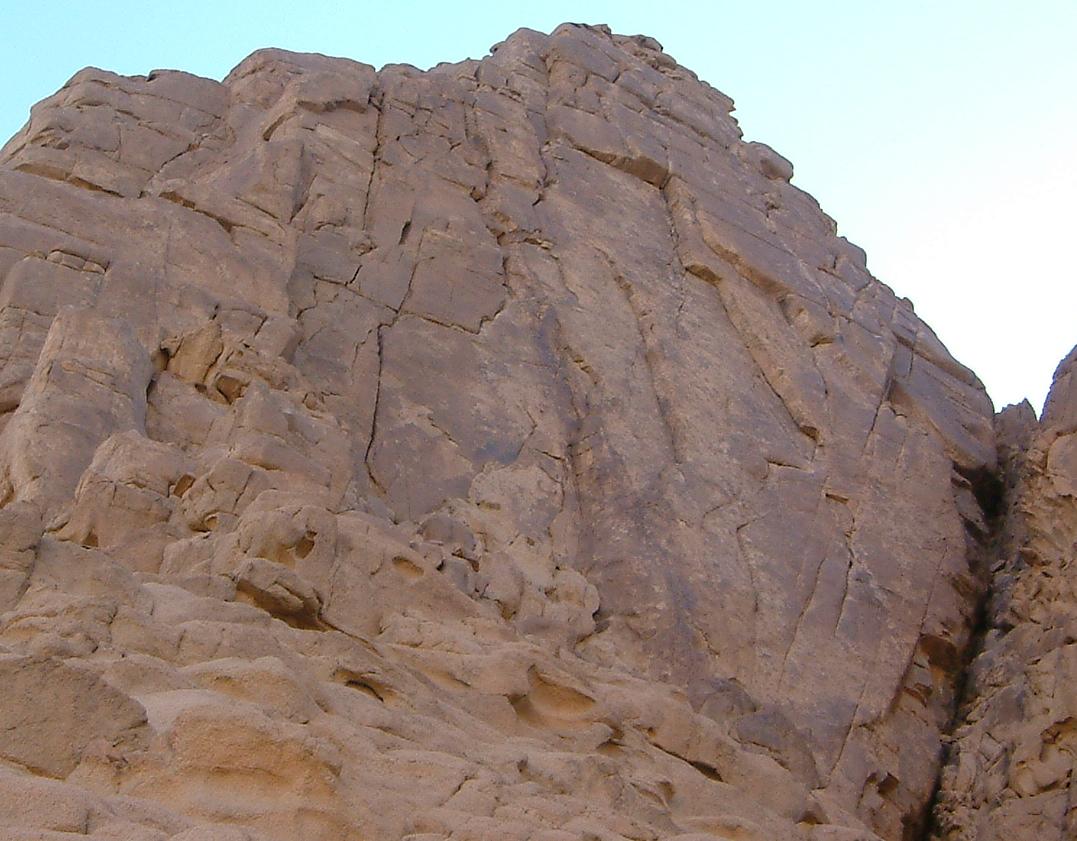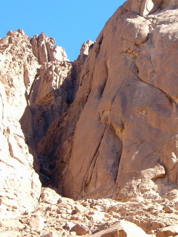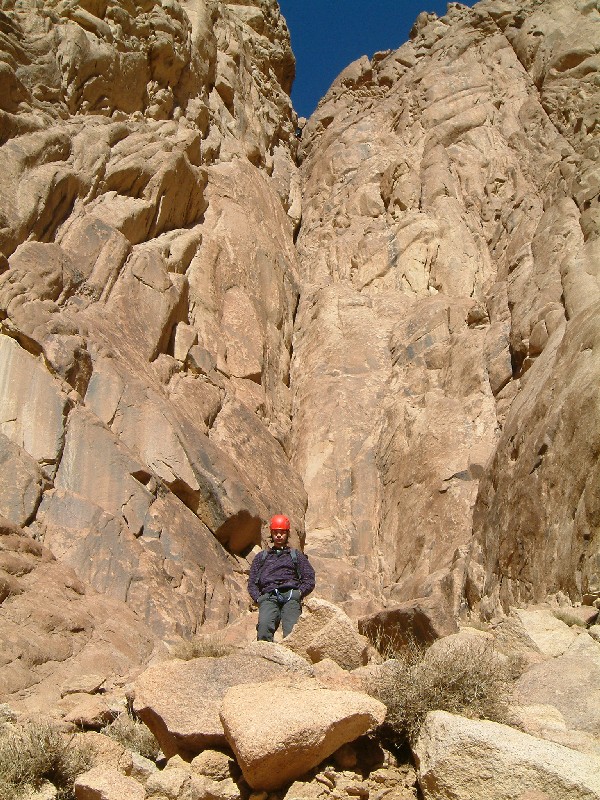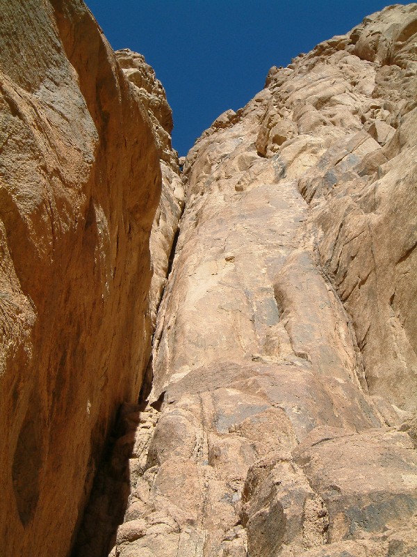 Approach: Access to this climb is through valley Wadi El Arbain, which is situated between mountains Jebel Rabba on the right and Jebel Fara on the left. First on the left is one of the tops of Jebel Fara, where goes a route Pharaoh's Chimney. We pass also its second peak and before bustan with several tall cypresses on the right side one can see on the left third peak, which looks like two horns. This is the starting point to our climb. We ascend without rope up to the point, where is isohype thick, darkly colored crystalline dyke (magma that here broke its way upwards through cracks). This dyke cut across "pyramid" (big slab which called first ascenders of the route Big Pyramid according to its shape pyramid), lower truncated part of which is depressed and about 3 m above of it continue its upper part.