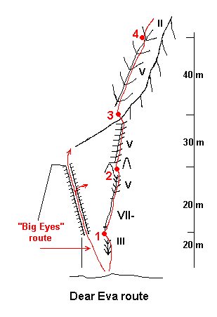 Pitch4: 25m, V+. Traverse left for about 8m, good hand holds in thin crack (V+), then diagonally up and right along wide fissure (V+, A1), well protected