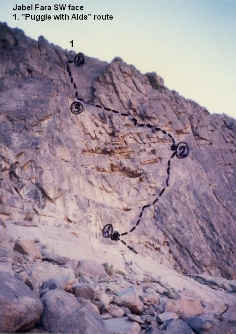 The hungarian wall: This is steep wall up wadi Srej, on the NE side of j.Fara. Several short routes (including bolts) were opened by the hungarian expedition opposite of "scala del cielo", march-april 1990,