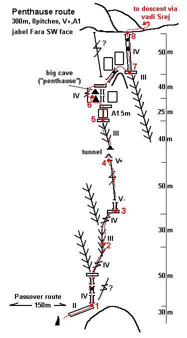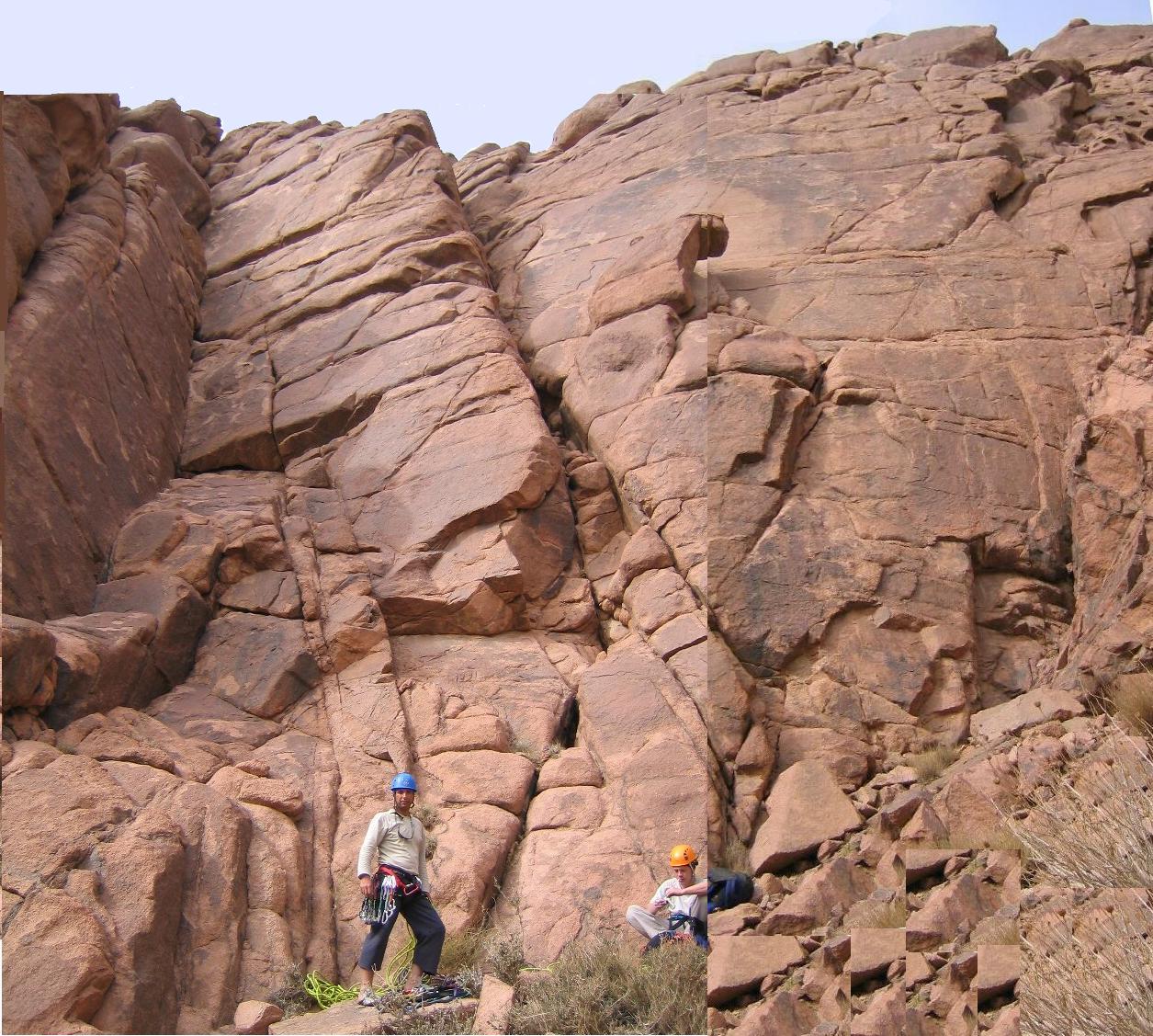 Approach: The route starts on the left part of a big slab looking like a pyramid above the beginning of the first garden (Boustan) in wadi el-Leja. Reach a narrow dyke (IV) follow to the top of pyramid (IV), then keep to right of big chimney till a big terrace (III to V-). Walking right till continuation of chimney and follow to the top (III to IV), exit through diedre with chimney. Approx. 200m