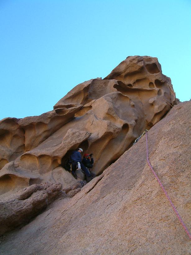 In sloping walls, wherever an irregularity of the surface forms a pocket, water is retained. The erosion increases the size of the pocket until it touches the neighboring pocket, and creates a layer of friable material beneath the surface, covering large areas of the wall, with typical "coves" and "bridges" imbedded in it. This kind of granite is the least reliable one, from a climber's point of view, although its many bridges do offer protection points to pass a sling through. See example of this structures (Safsafa NE wall "Afrika" part)