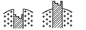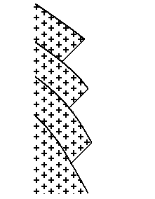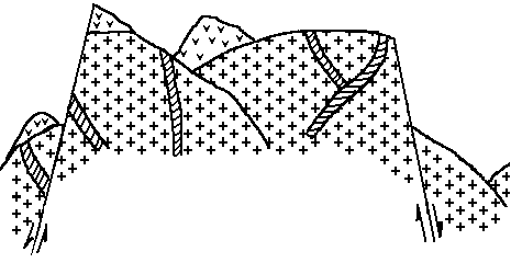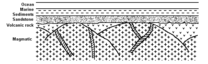 After their formation, these magmatic rocks were deeply eroded, and then covered by layers of sedimentary rocks for most of their subsequent lifetime. These sediments were formed either at the bottom of a rather shallow ocean, in which case limestone layers and their relatives are found, or on the continent itself, in which case sandstone is found. In the following sketch: + is a granite, v is volcanic rock, and dark stripes are dykes.