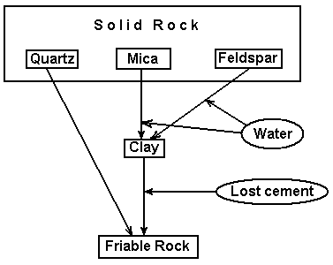 The granite is composed mainly of three minerals: Feldspar, Quartz and Mica. The Feldspar and the Mica portions, with the addition of water, may convert, under favorable conditions, into clay minerals, in which case the rock texture disintegrates, as if the cement between the bricks of a wall is removed, and the wall then looses its strength.
