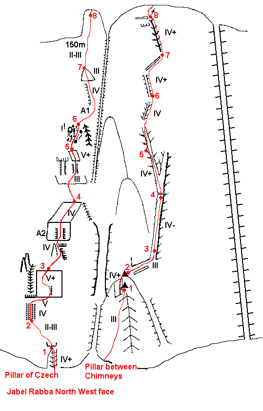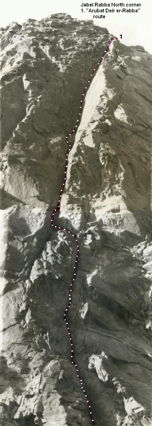 First ascent: Giuseppe Gallizia, Yossi Korem, 1984, 8 pitches, VII-, J.Rabba, NE face
