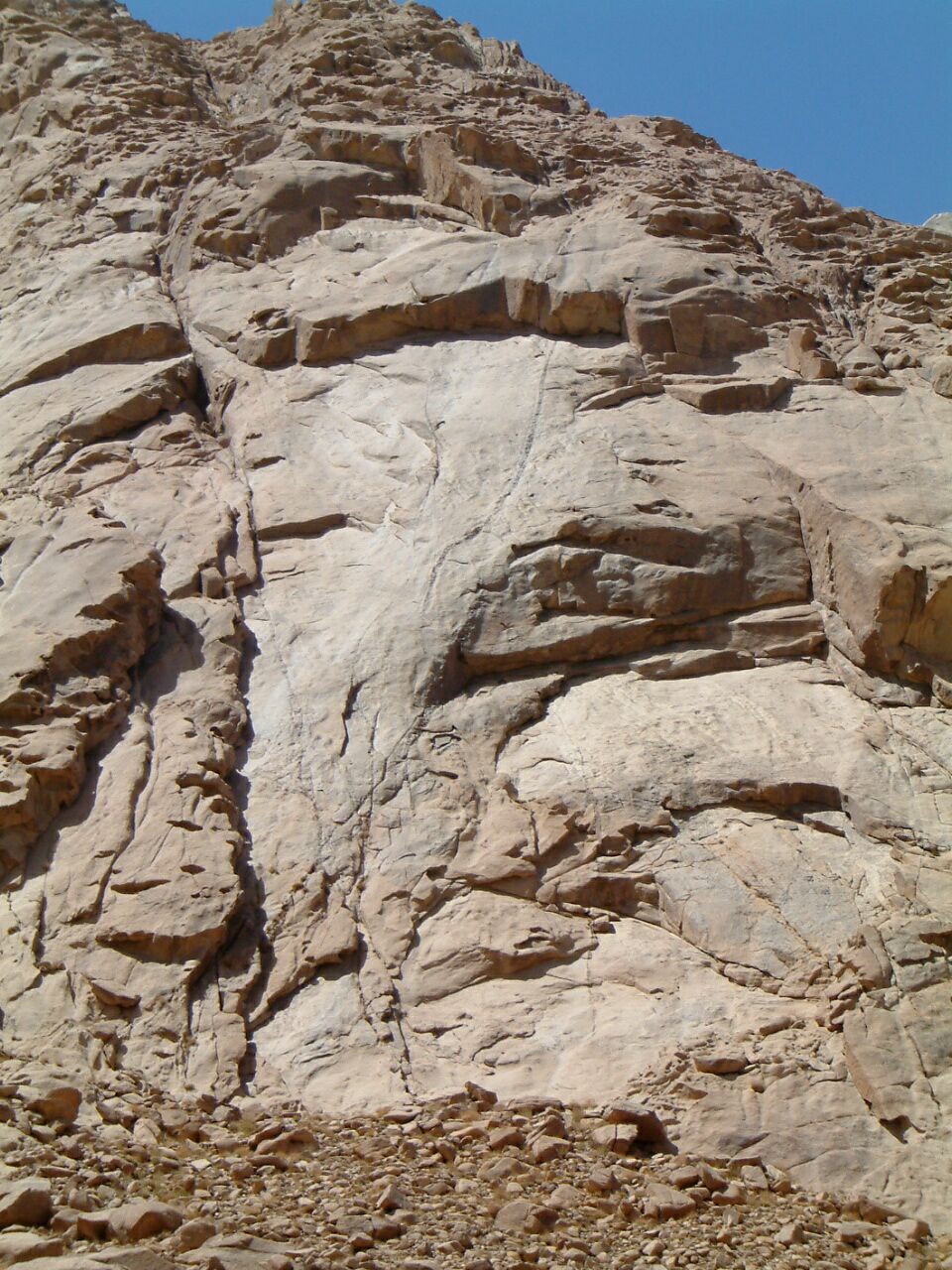 First possibility – cross the Safsafa plateau with its many crisscrossing small valleys. Follow direction S-SE till a gully reaching an inner valley enclosed by Safsafa and Jabel Musa (chapel), the path left bring to the monastery the path right (and up to a small pass) reaches wadi Shrej. With brings back to the foot of the north wall of Safsafa. Instead of wadi Shrej it is possible to reach wadi El-Leja and the field school passing a further pass.