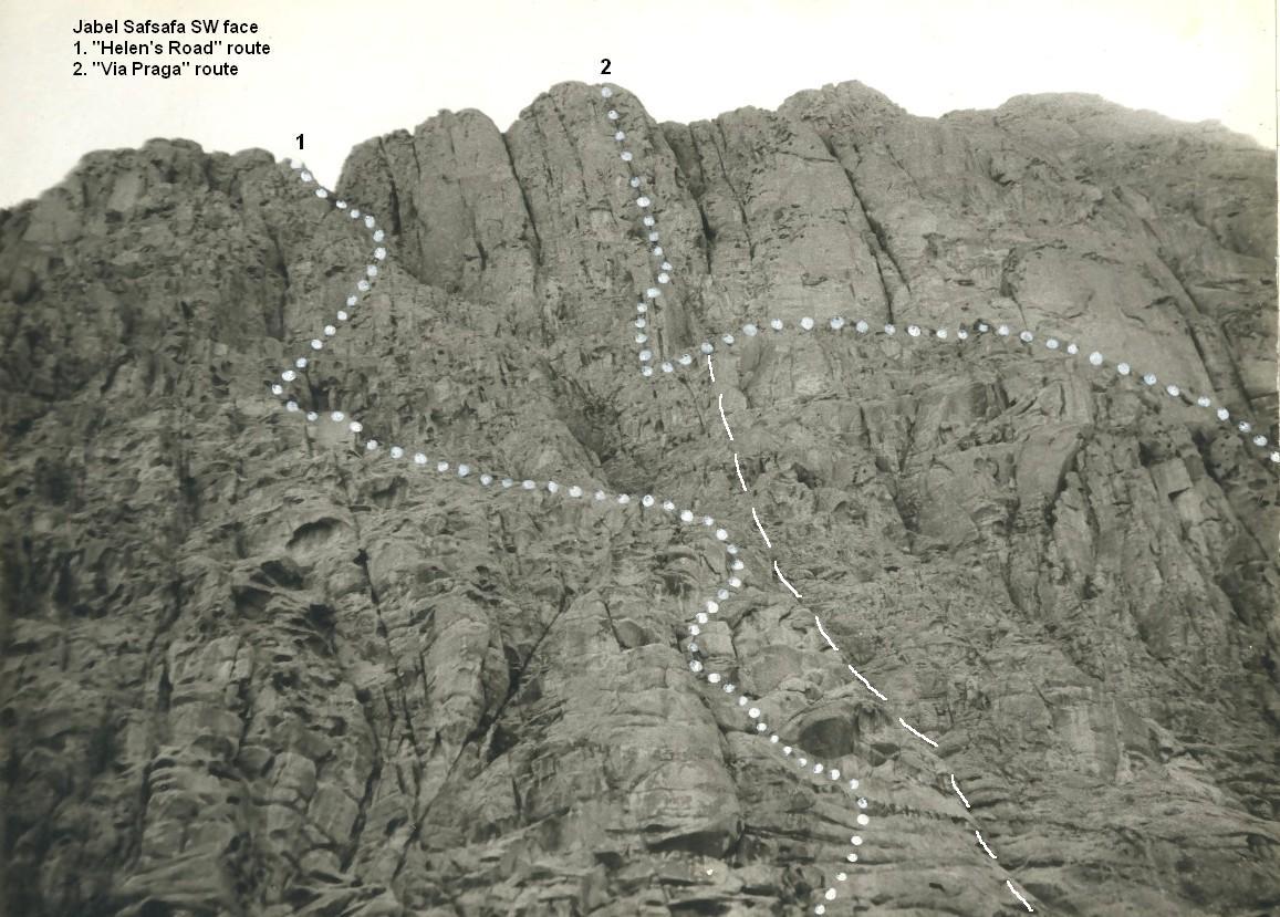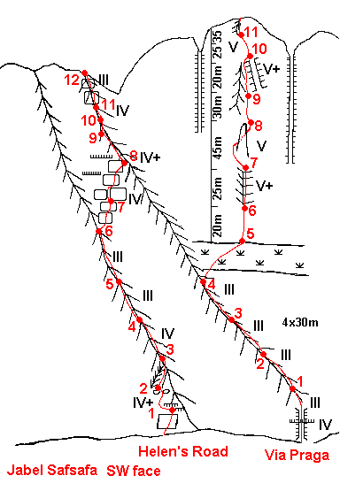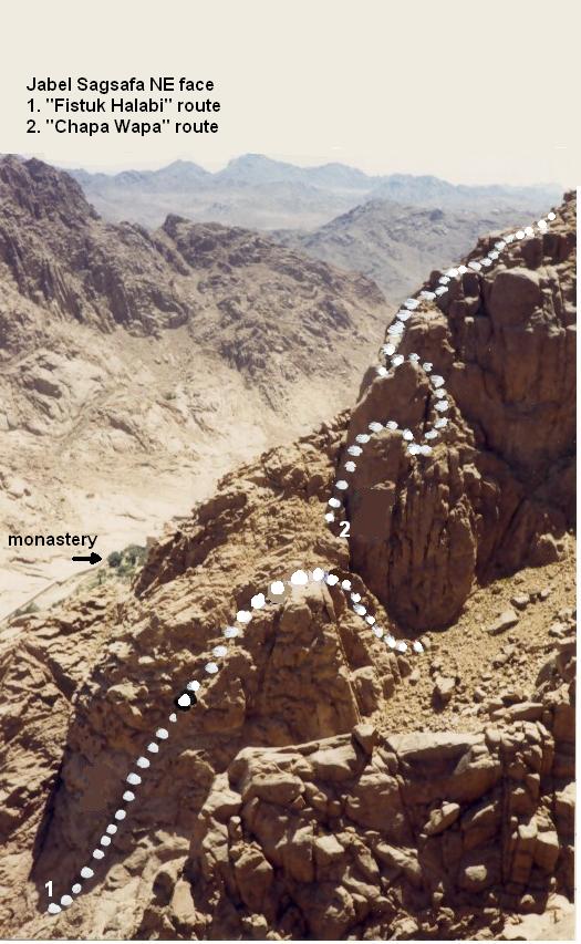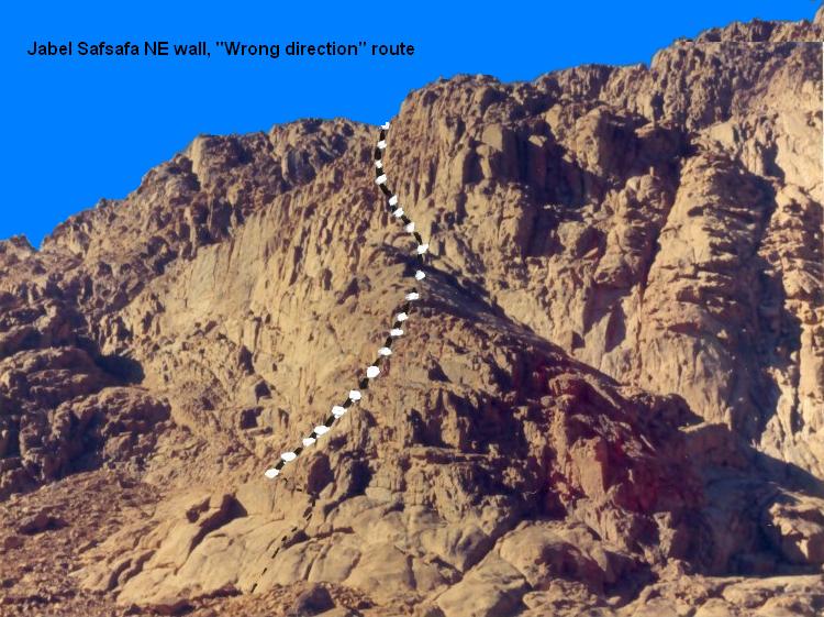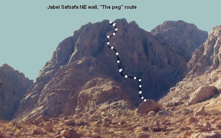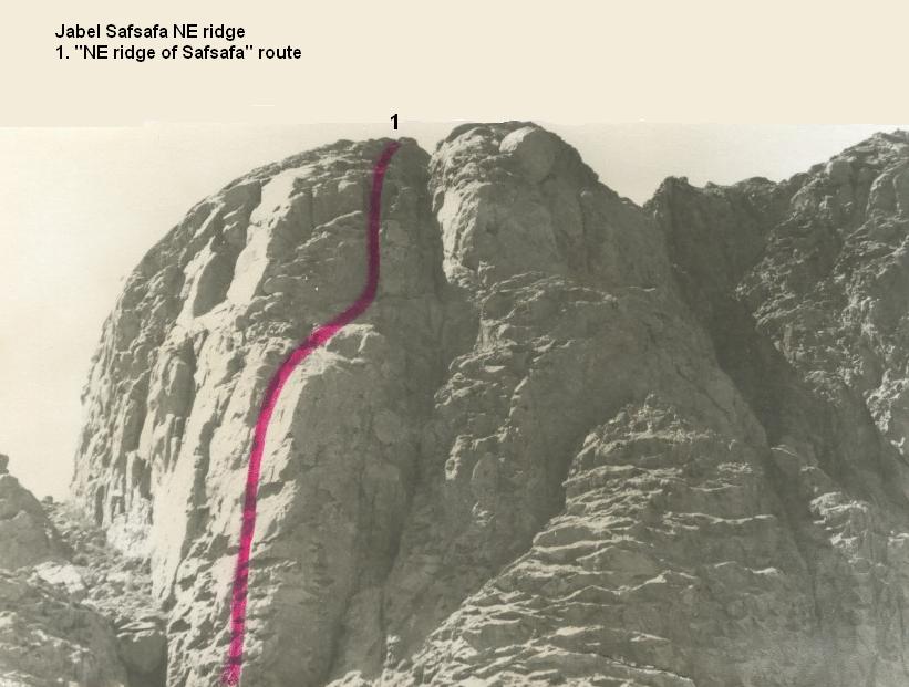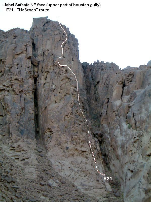Approach: when descending wadi Leja (below Safsafa) pass big gully separating main Safsafa from lower peak and continue 200m till first major ridge. There are 2 ways to start the route: from the bottom of the ridge and then up and left to crack that starts 30m up and then up this crack (5.6,5.7,5.7+ with much scrambling) or up crack on left (North) wall of ridge (5.7,5.8). Both routes meet here. Continue up left of 2 gully systems (40m. 5.3) to crack on (15m, 5.9). Go up wide crack/gully (40m, 5.3) to o/w crack on left. Follow this crack (5.10, 5.8, 5.7) thru small cave to top. Descent right (South) to saddle... Protection: big hexes or #4 friends. Rocks good in the hard sections