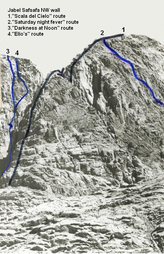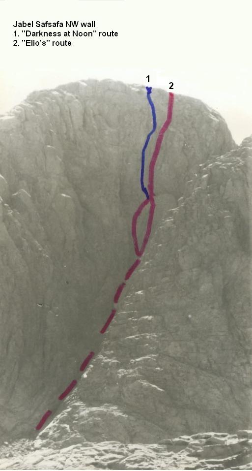 First accent: Daniel Peikes, Danny Wolfstein, 1989, 2 pitches, VI+, 5.10, V, J.Safsafa NE face (east (monastery) part).
