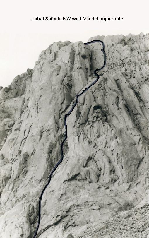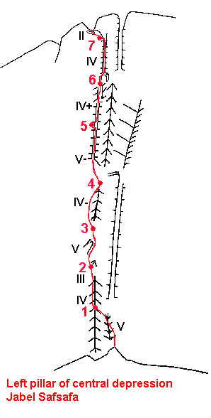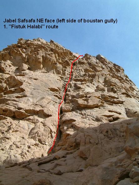 Walk past well (spring?) (150m left) to first ridge on right. Start up slab (III) to corner. Traverse left 5m (V+) with one move of 6a (possible avoidable). 5 more easy pitches (III+) to top of first ridge. Down dyke (3m) then left and up along fissure below the face (III). Straight up to first summit (not continued to top of Safsafa)