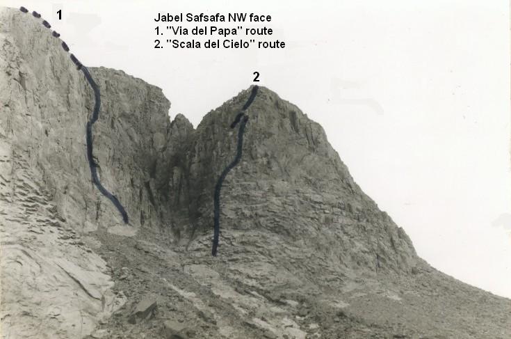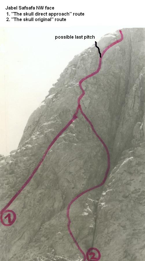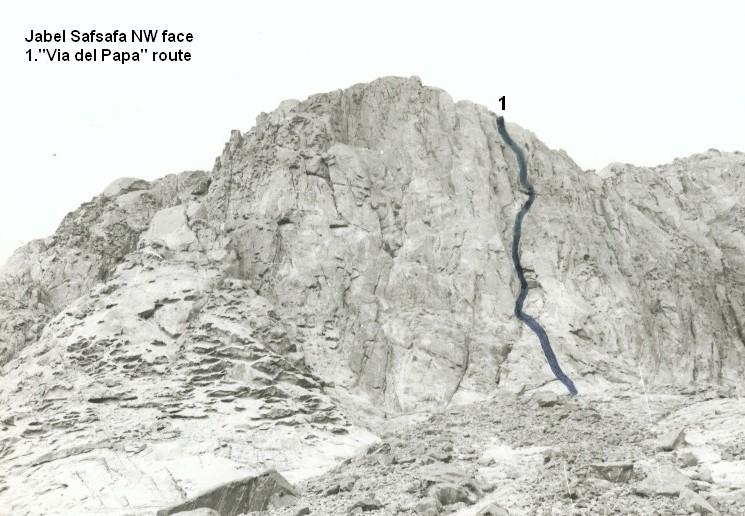 First ascent: Victor Kaftal, Bruce Devensg, 1977, 18 pit., 700m, IV+ A1, J.Safsafa N face