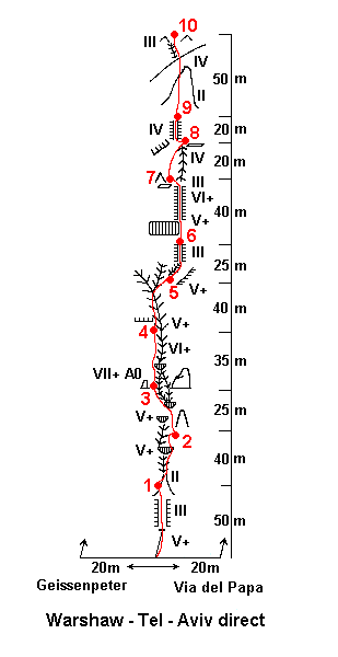 This excellent route is going between "Warshaw-Tel-Aviv direct" and "Via del Papa", conversing with the "Grand hand traverse" and "Chockstone" chimney variations of the latter. Five pitches at of eight are highly recommended, four of these five being continuous 5.10 climbing on solid rock, positioned beautifully with much exposure and the thrill of being high up yet well protected and safety "jammable".