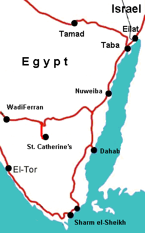 The Santa Catherine area is located in South part of Sinai peninsula about 100km West of Nuweiba on Read Sea cost. The convenient means to reach St.Catherine area is by Bedouin taxi from Taba, Nuweiba or Sharm el-Sheikh. Distances: Sharm - St.Catherine = 220km., Taba - St.Catherine ~ 240km. The price for one person usually $10 - $12, time for one way ~ 2,5 hours. The road is mainly asphalt.